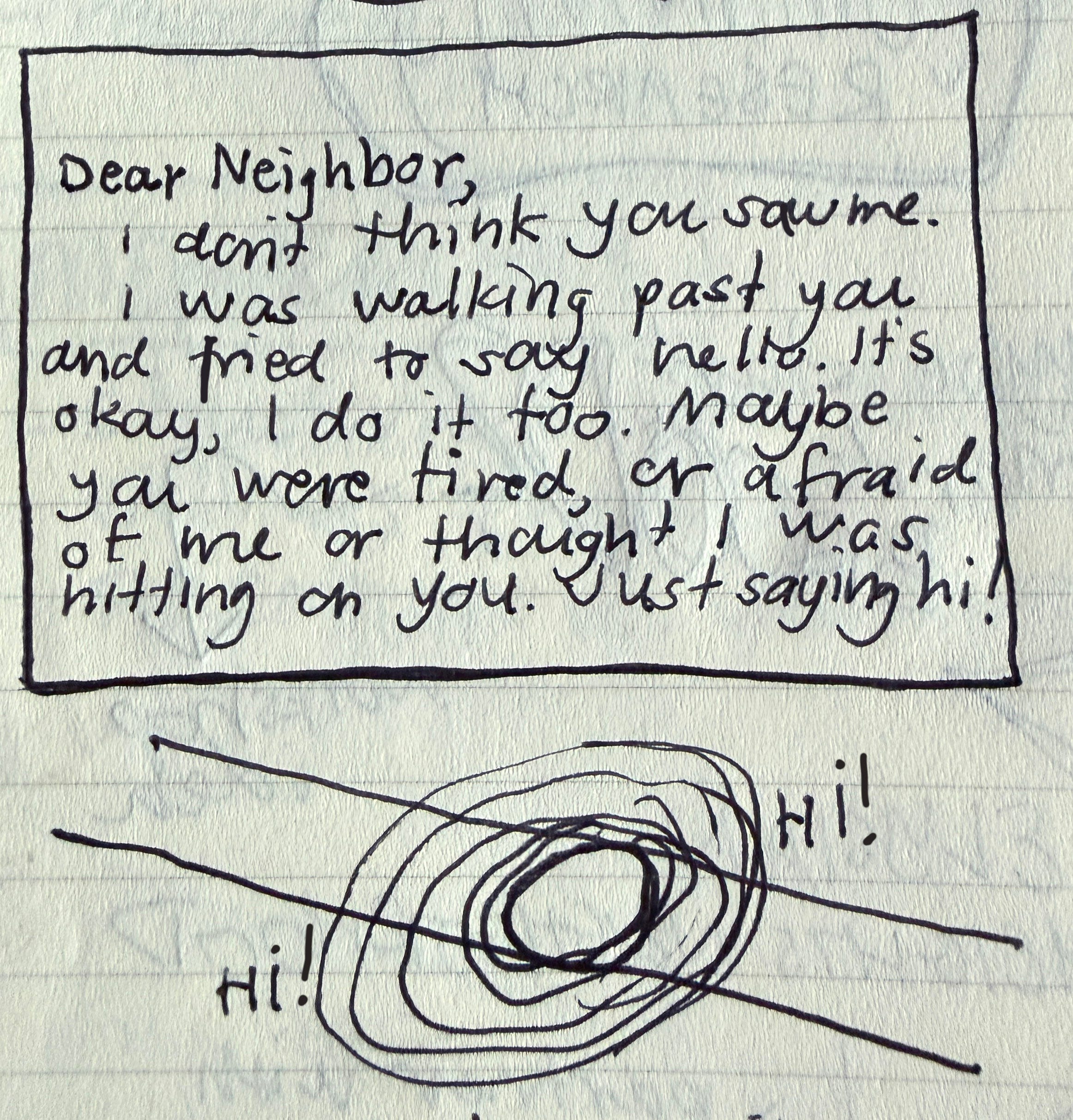 I, of course, prefer a more systematic approach but I have a feeling that all of us have devised their own protocols for how to engage with another human in the world. I have been wondering what makes us decide, in that split second, whether to acknowledge the human walking toward us or pretend they don’t exist?